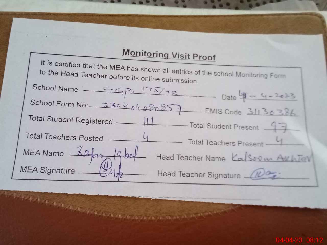 | Attendance Register | Head Teacher | MEA with School | Visit Proof |