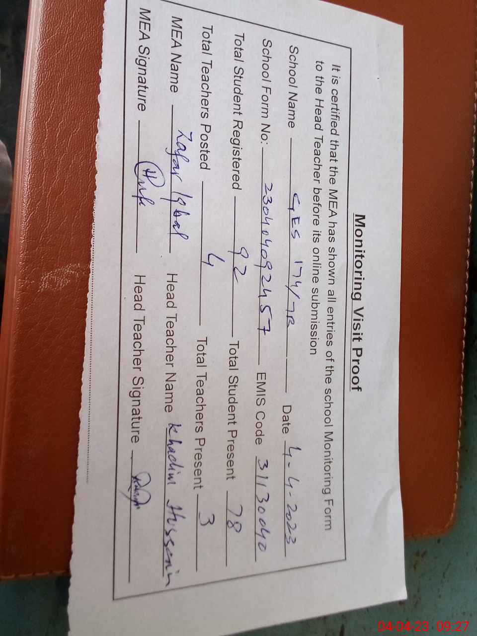 | Attendance Register | Head Teacher | MEA with School | Visit Proof |