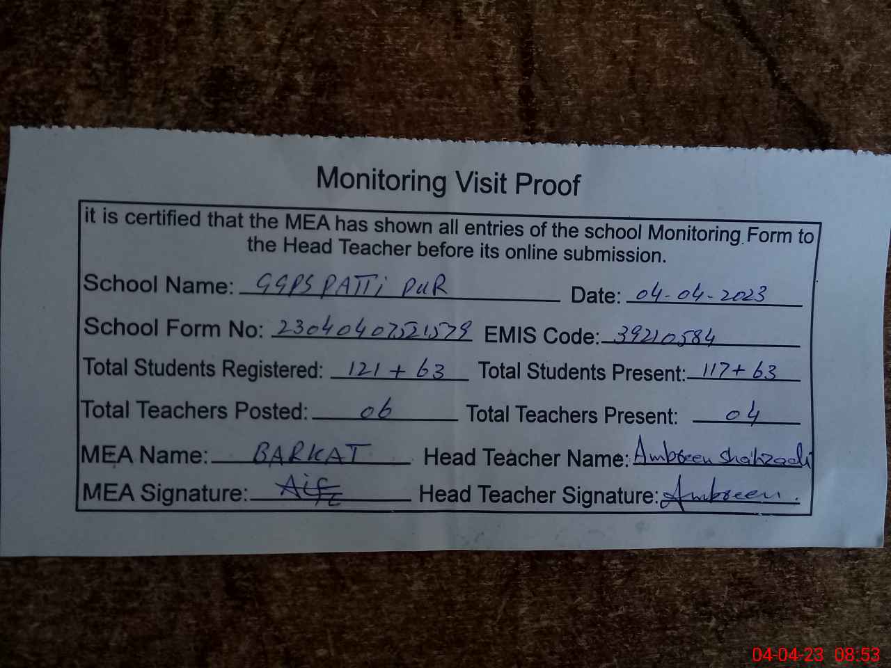 | Attendance Register | Head Teacher | MEA with School | Visit Proof |