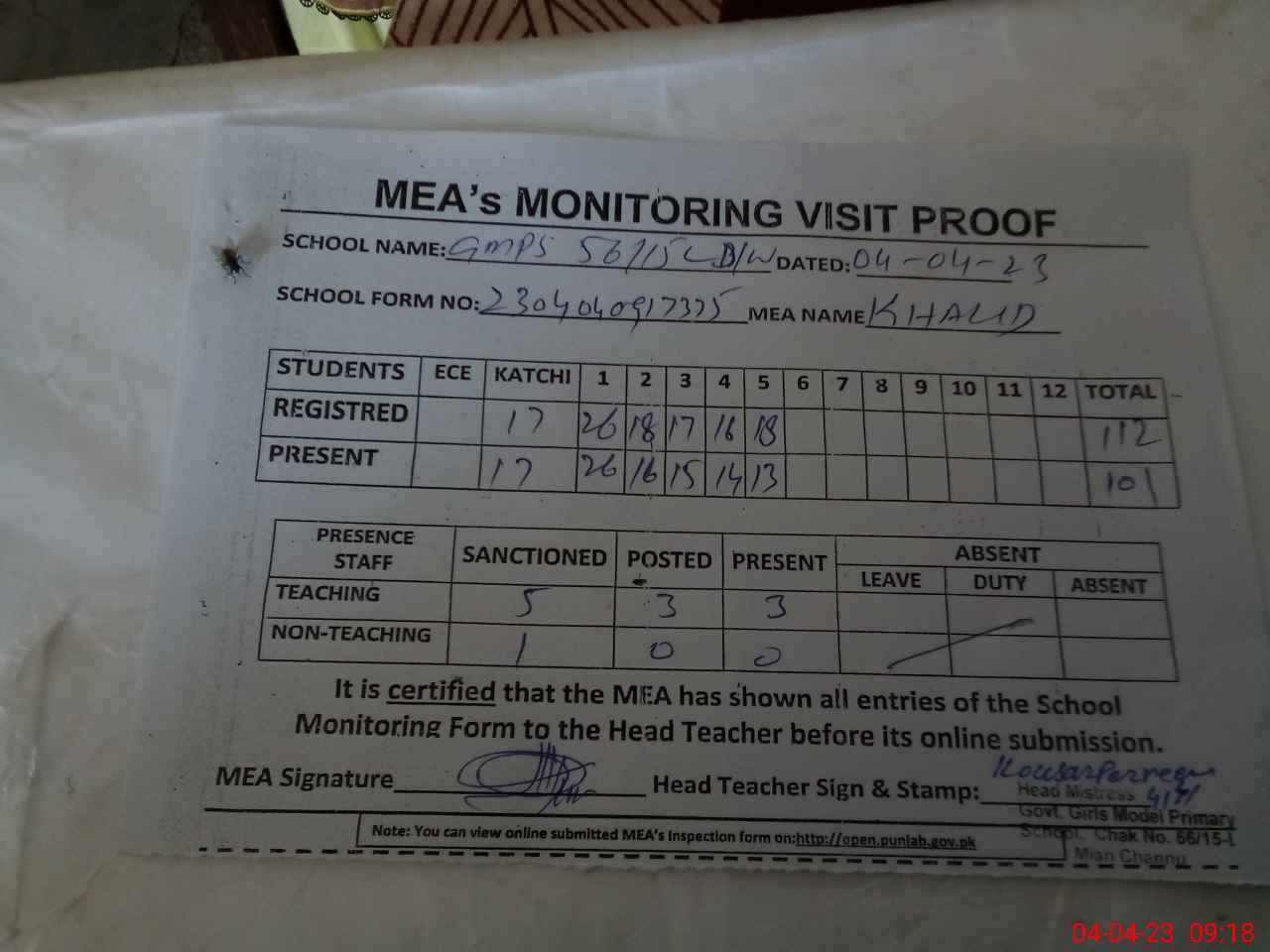 | Attendance Register | Head Teacher | MEA with School | Visit Proof |