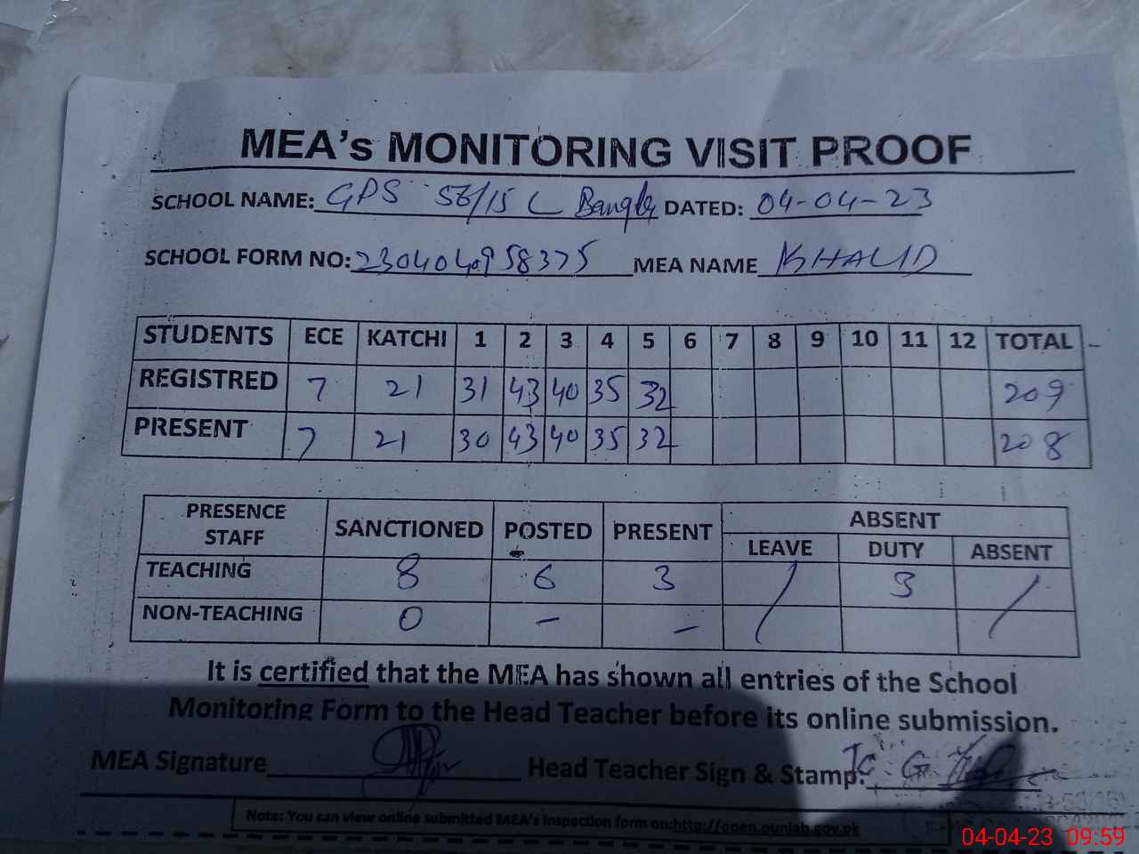 | Attendance Register | Head Teacher | MEA with School | Visit Proof |