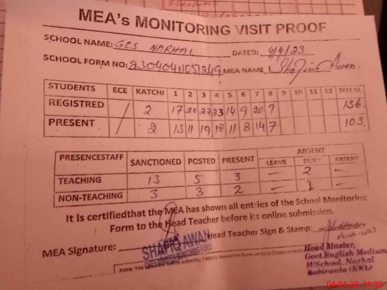 | Attendance Register | Head Teacher | MEA with School | Visit Proof |