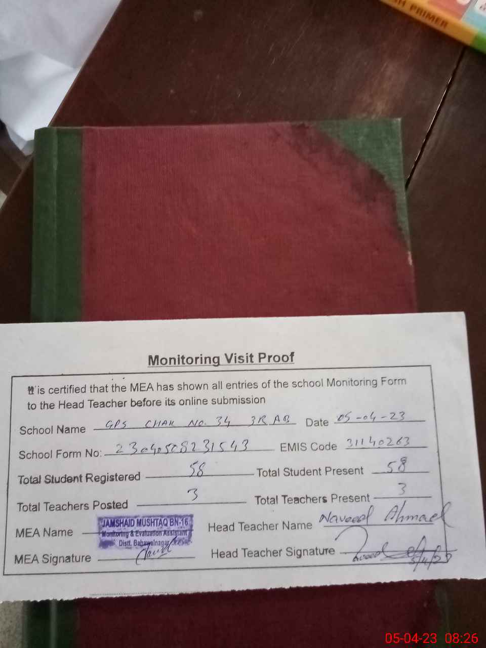 | Attendance Register | Head Teacher | MEA with School | Visit Proof |