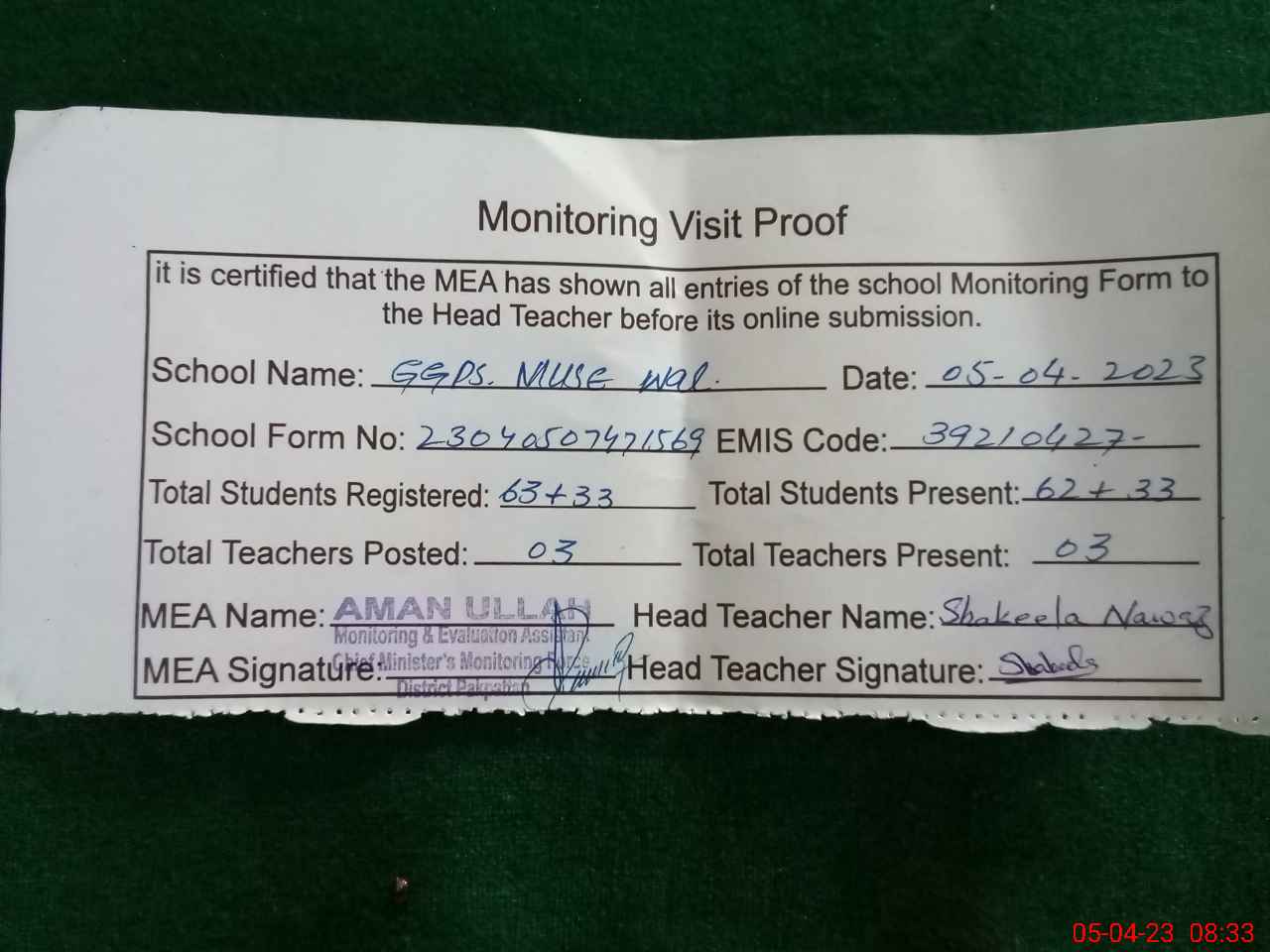 | Attendance Register | Head Teacher | MEA with School | Visit Proof |