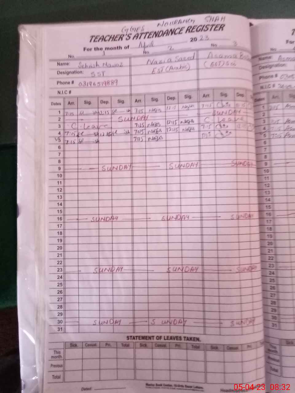 | CNIC | Full Name | Designation | R/C | Absence During Last Calender Month |