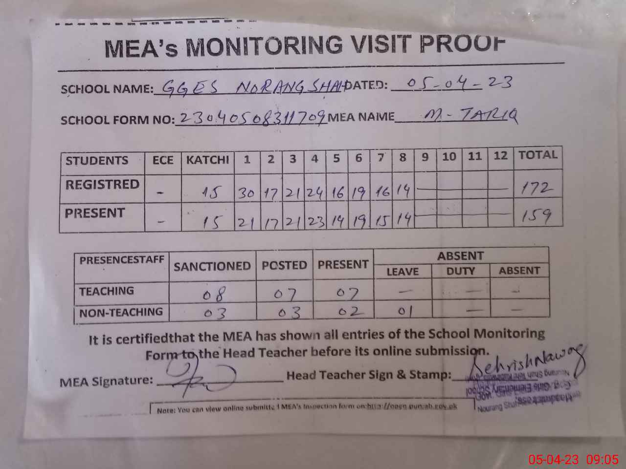 | Attendance Register | Head Teacher | MEA with School | Visit Proof |