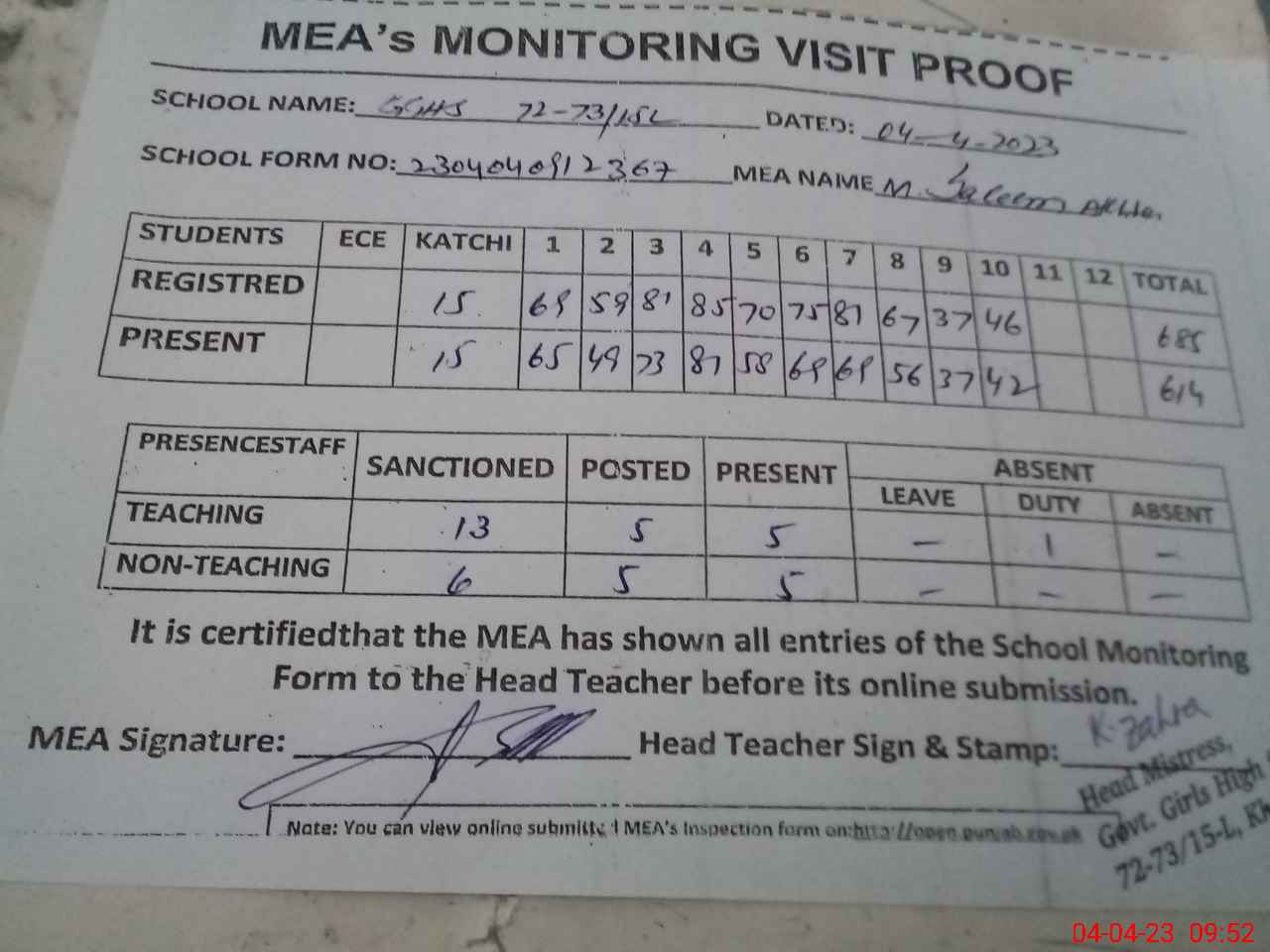 | Attendance Register | Head Teacher | MEA with School | Visit Proof |