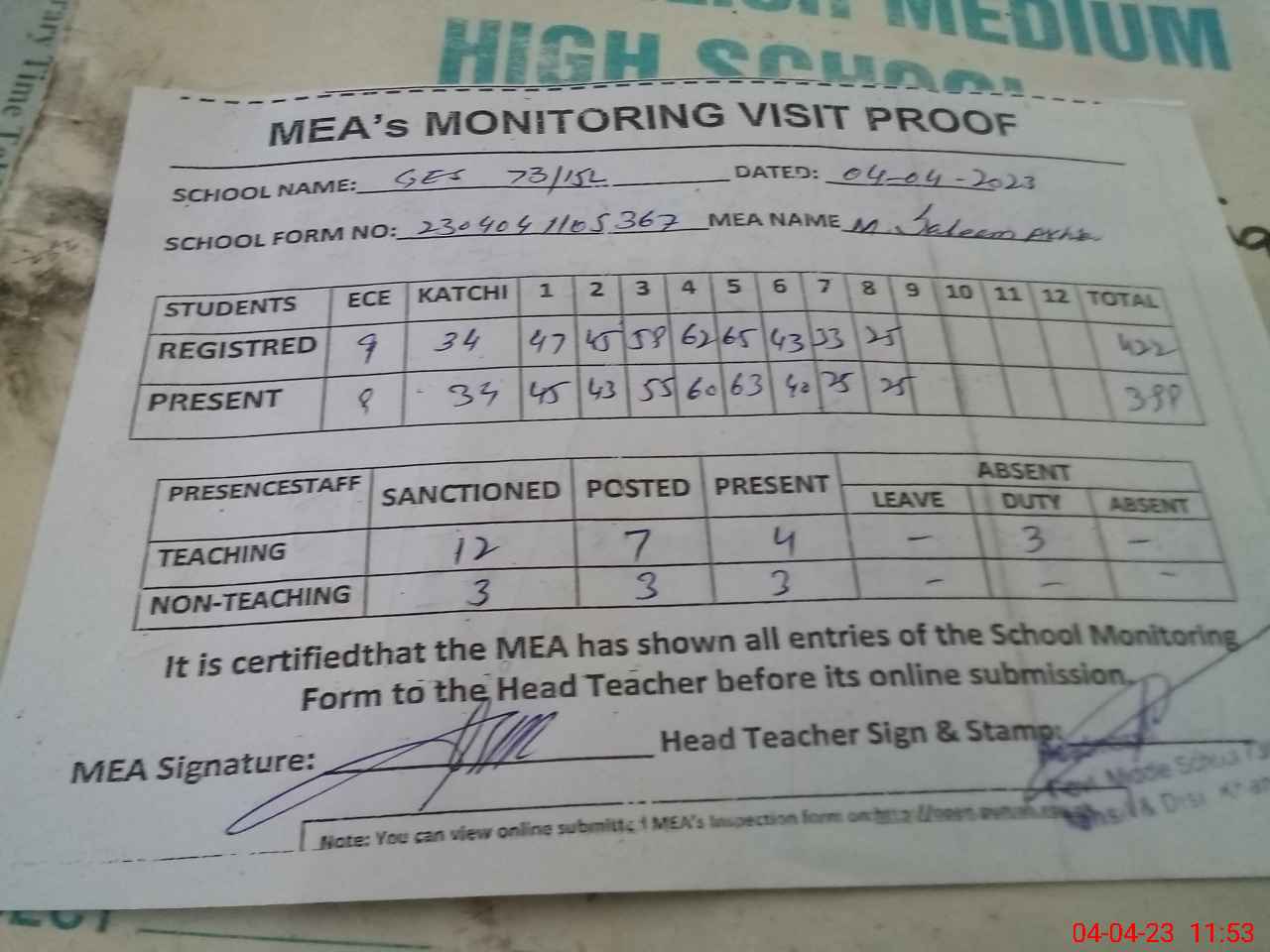 | Attendance Register | Head Teacher | MEA with School | Visit Proof |
