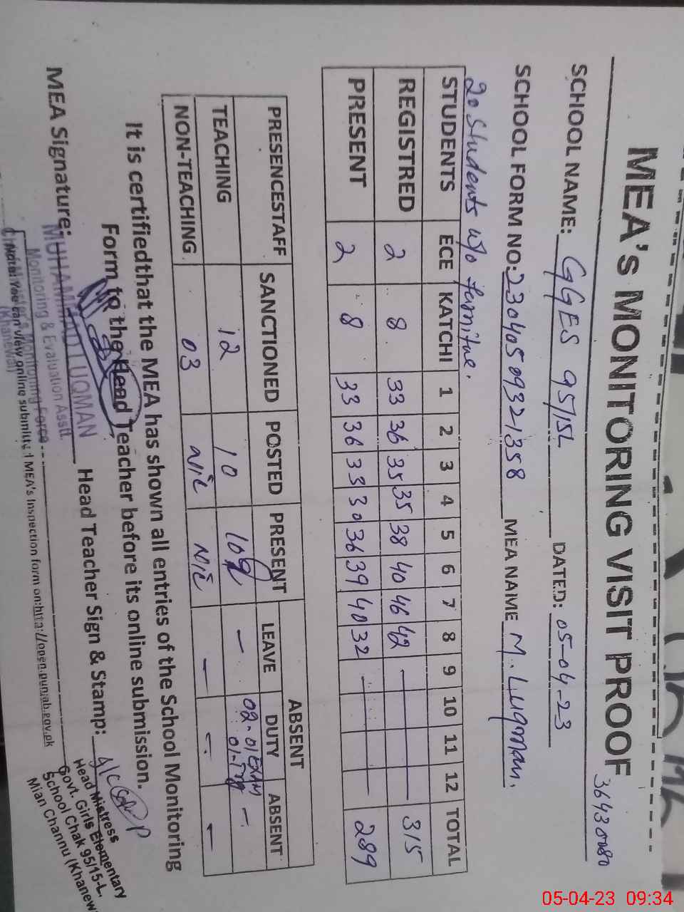 | EMIS Code: 36430080 | Name of School: GGES 95/15-L, MIAN CHANNU | |||