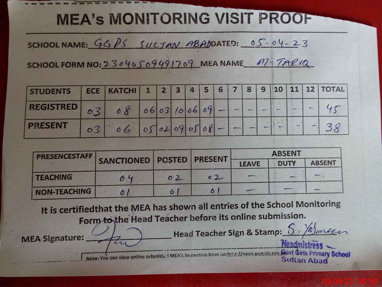 | Attendance Register | Head Teacher | MEA with School | Visit Proof |