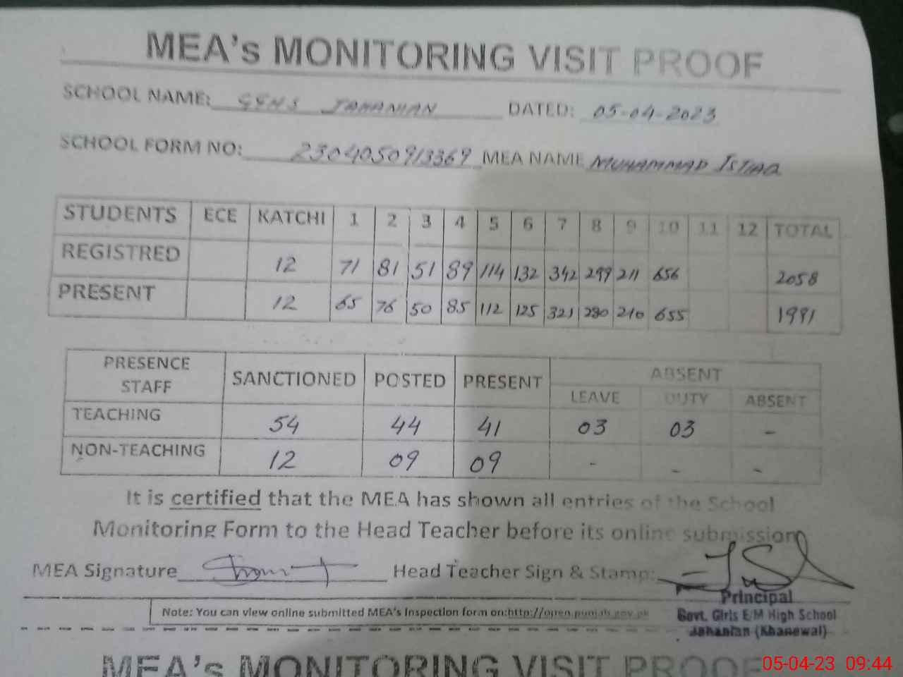 | Attendance Register | Head Teacher | MEA with School | Visit Proof |