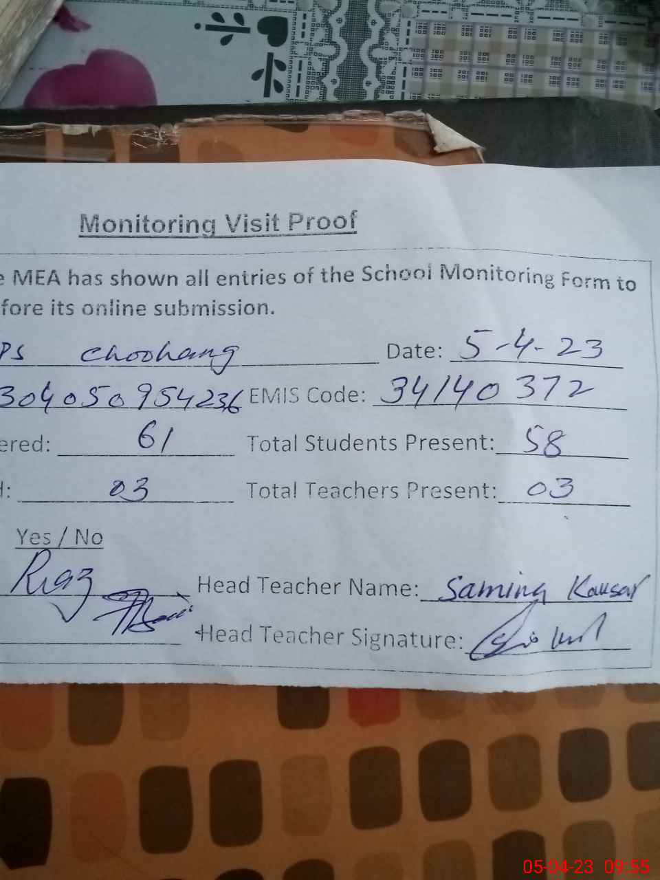 | Attendance Register | Head Teacher | MEA with School | Visit Proof |