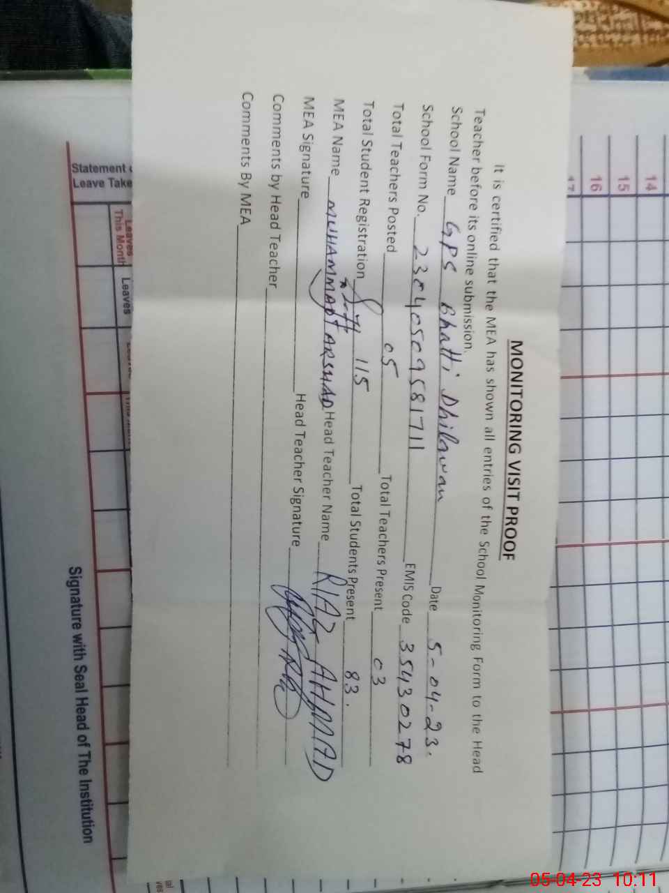 | EMIS Code: 35430278 | Name of School: GPS BHATTI DHILWAN | |||