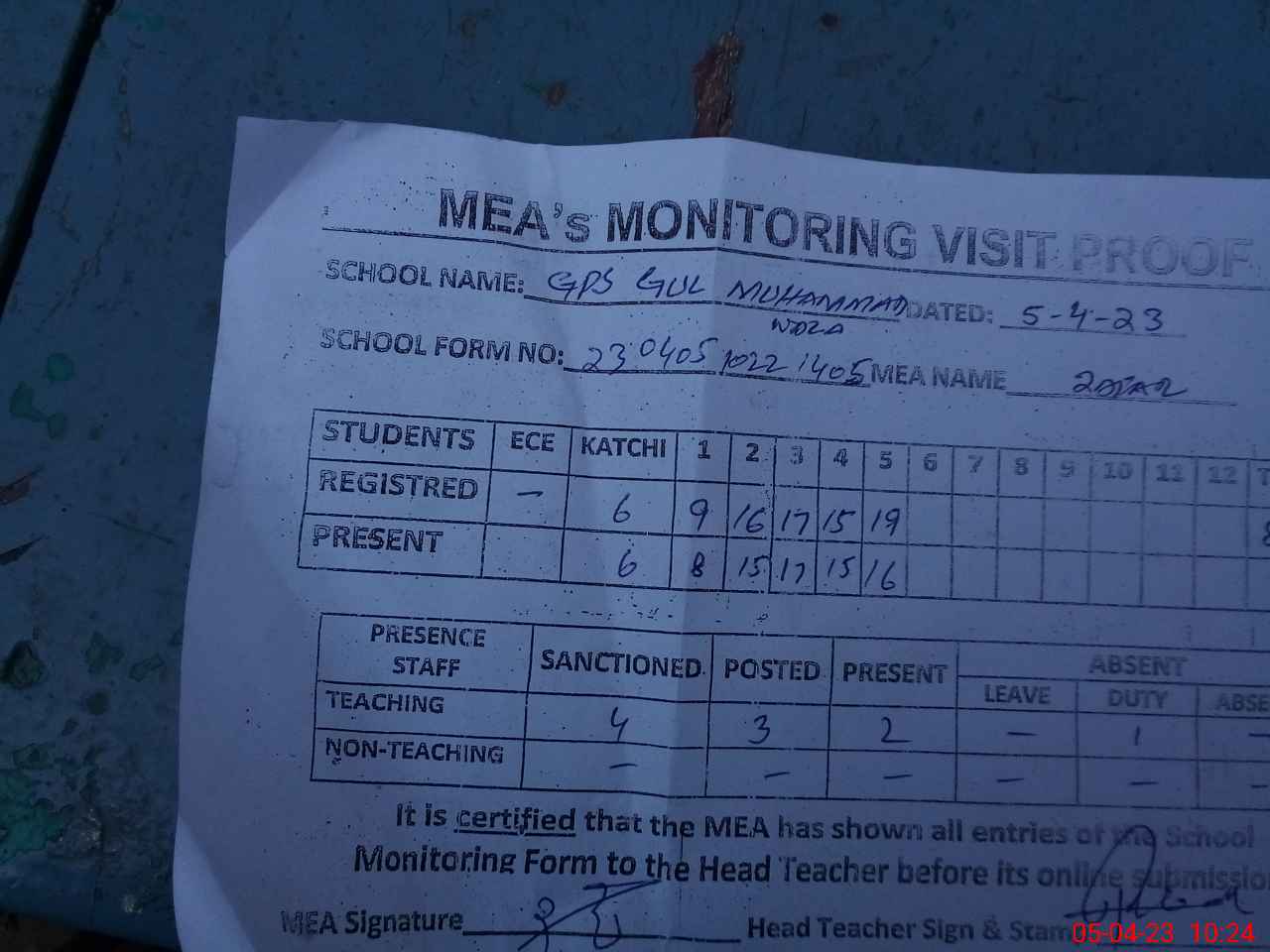 | Attendance Register | Head Teacher | MEA with School | Visit Proof |