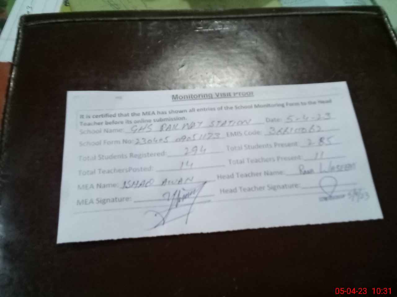 | Attendance Register | Head Teacher | MEA with School | Visit Proof |