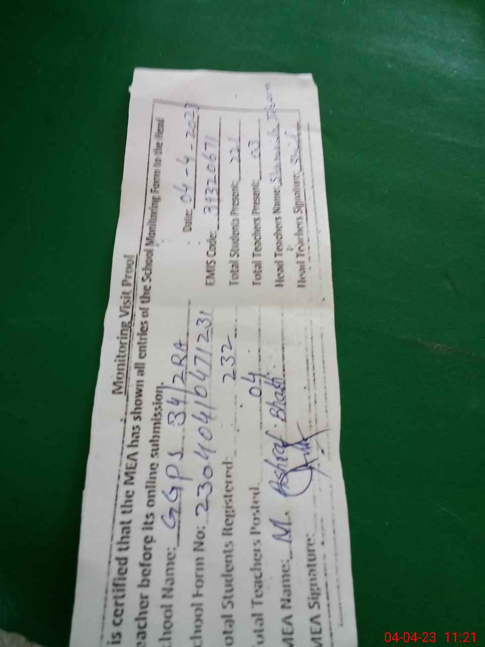 | Attendance Register | Head Teacher | MEA with School | Visit Proof |