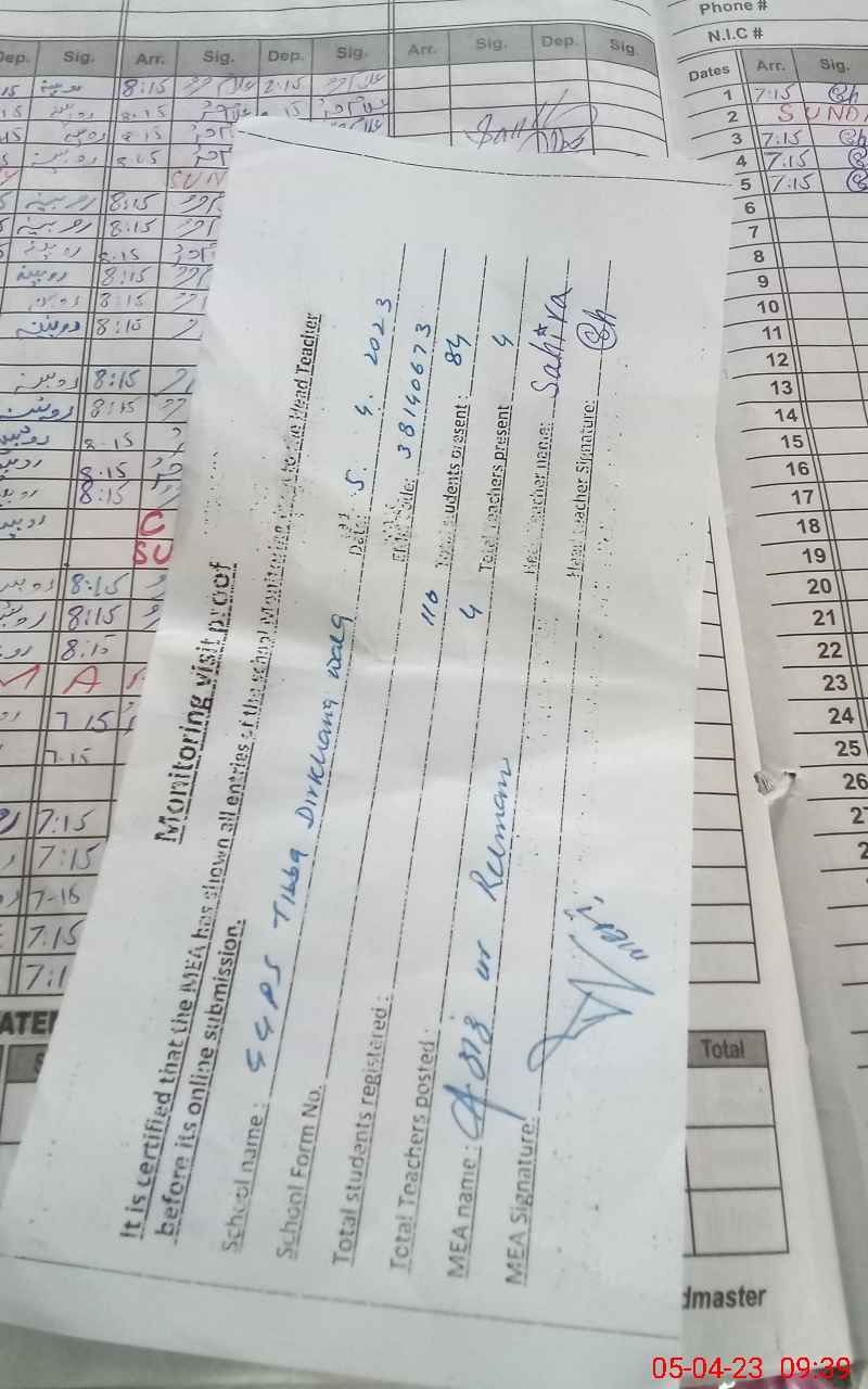 | Attendance Register | Head Teacher | MEA with School | Visit Proof |