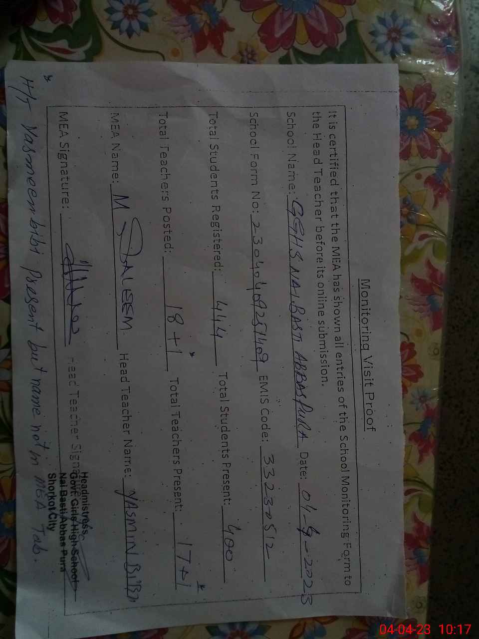 | EMIS Code: 33230512 | Name of School: GGHS NAI BASTI ABBAS PURA SHORKOT SHAHR | |||