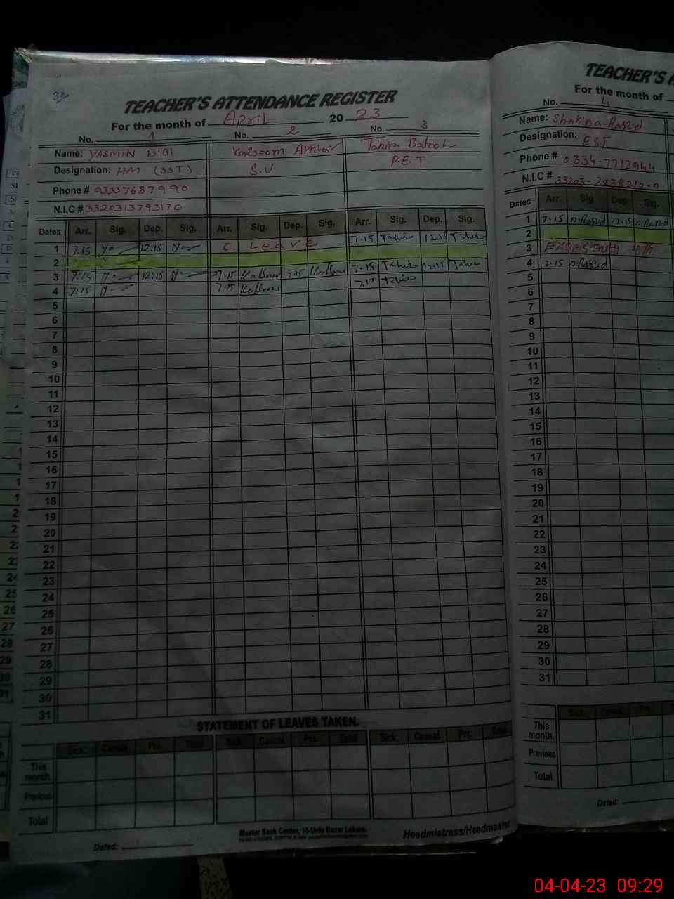 | Name: Ya**** Bi**** Designation: (School Headmaster's/Headmistress's) SSt Phone/Cell Number: 03**** |