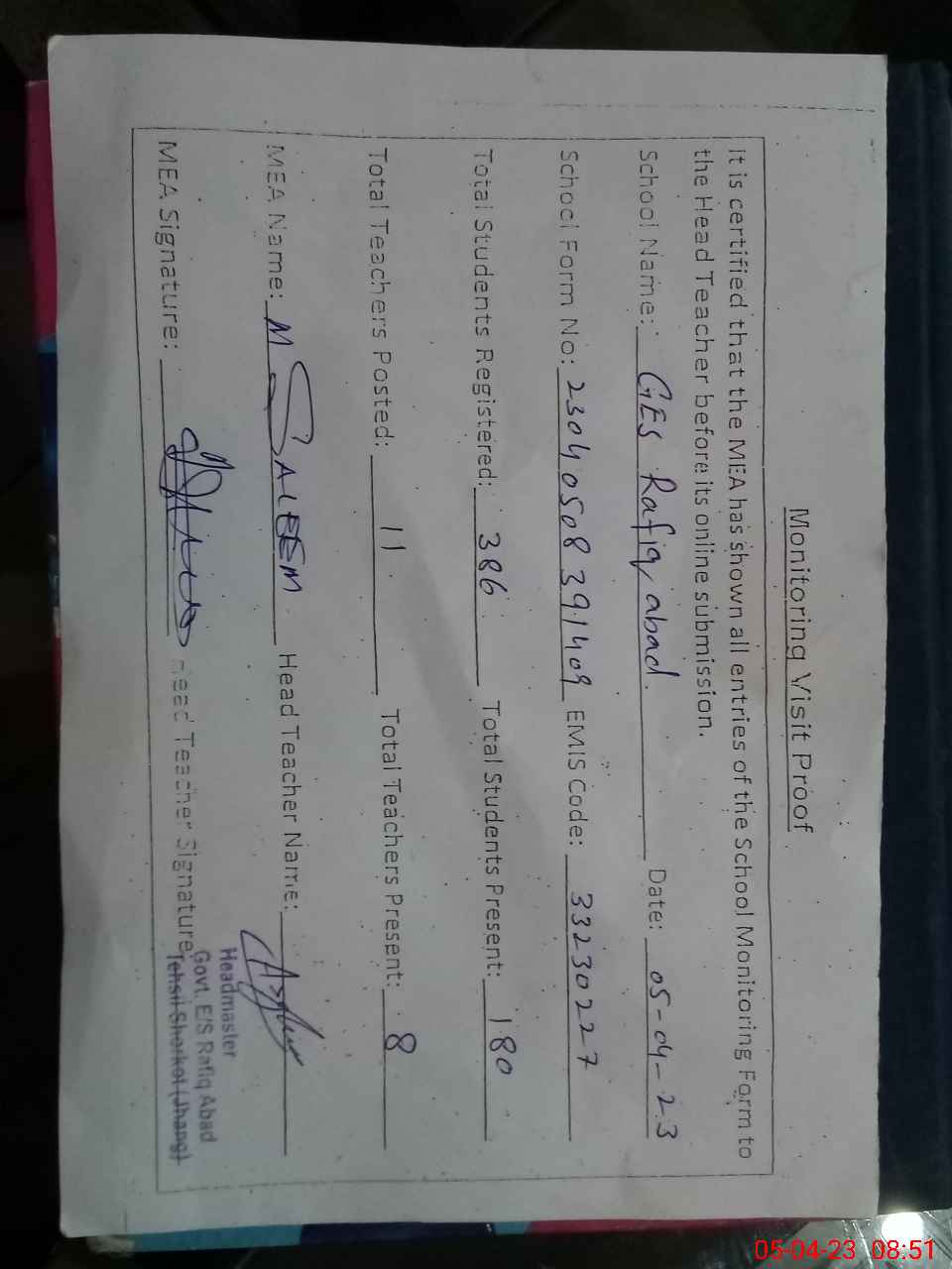 | Name: Ra**** Al**** Designation: (School Headmaster's/Headmistress's) EST Phone/Cell Number: 03**** |