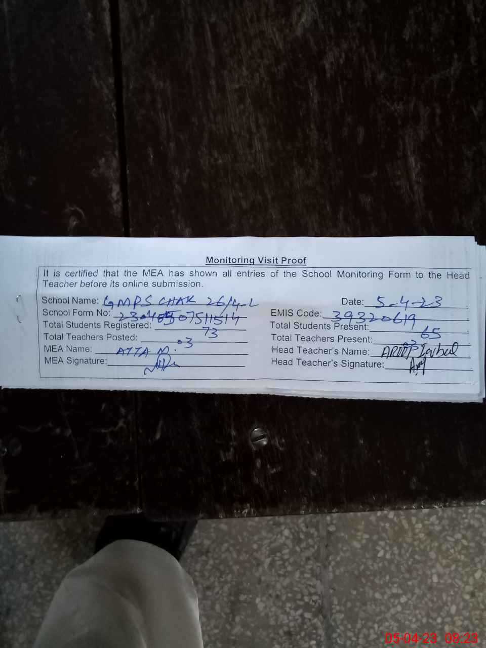 | EMIS Code: 39320619 | Name of School: GMPS CHAK NO. 26/4-L | |||