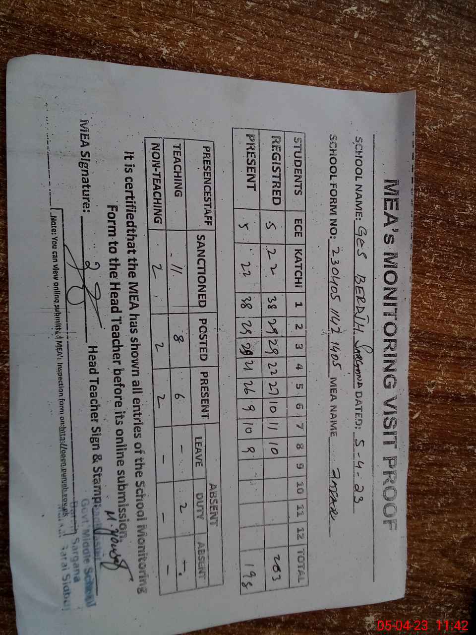 | Attendance Register | Head Teacher | MEA with School | Visit Proof |