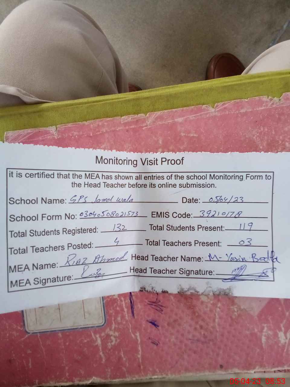 | Attendance Register | Head Teacher | MEA with School | Visit Proof |