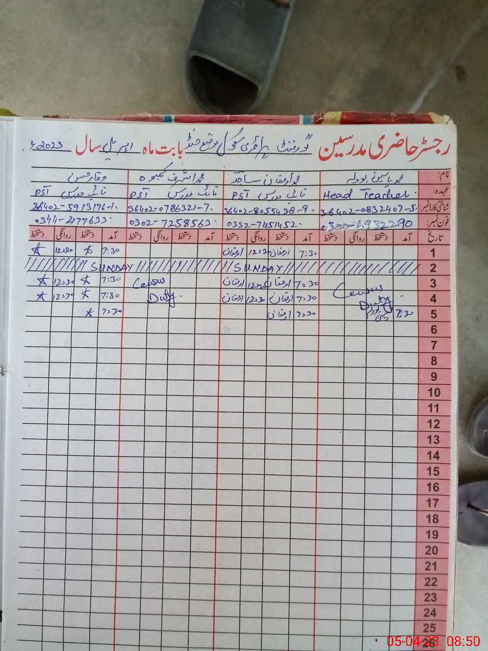 | CNIC | Full Name | Designation | R/C | Absence During Last Calender Month |