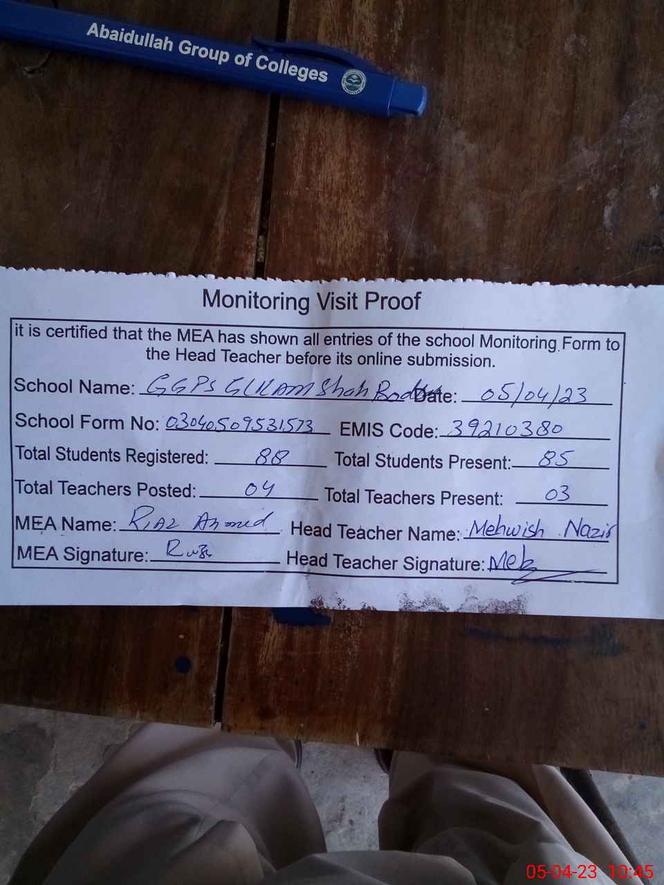 | Attendance Register | Head Teacher | MEA with School | Visit Proof |