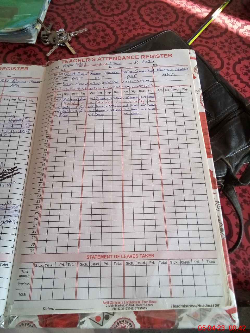 | CNIC | Full Name | Designation | R/C | Absence During Last Calender Month |