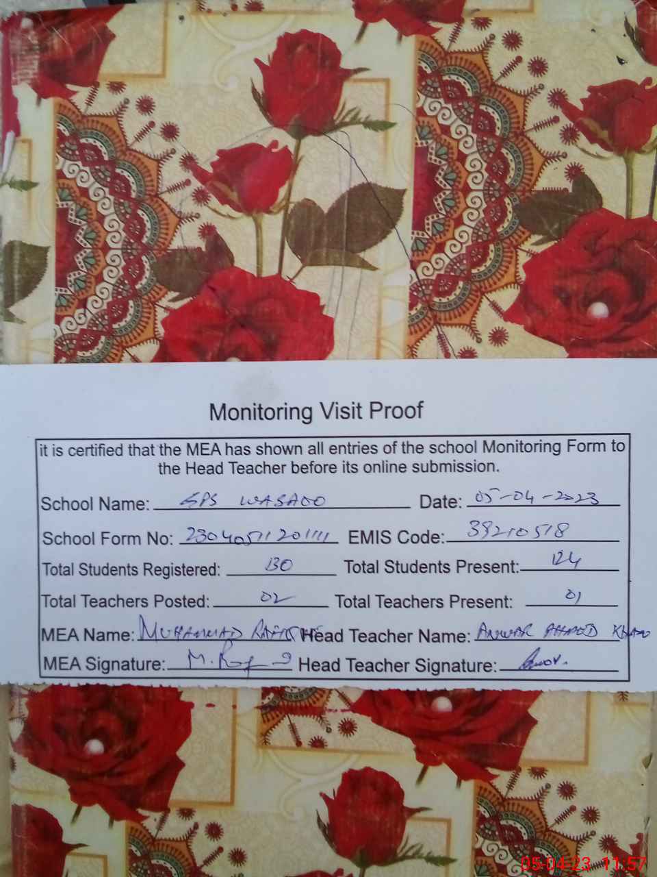 | Attendance Register | Head Teacher | MEA with School | Visit Proof |