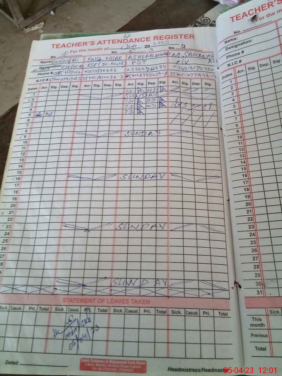 | Name: Gh**** Al**** Kh**** Designation: (School Headmaster's/Headmistress's) PST Phone/Cell Number: 03**** |
