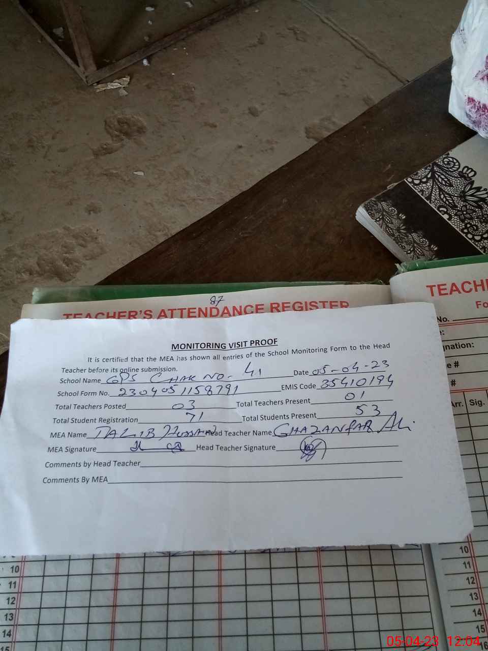 | Attendance Register | Head Teacher | MEA with School | Visit Proof |