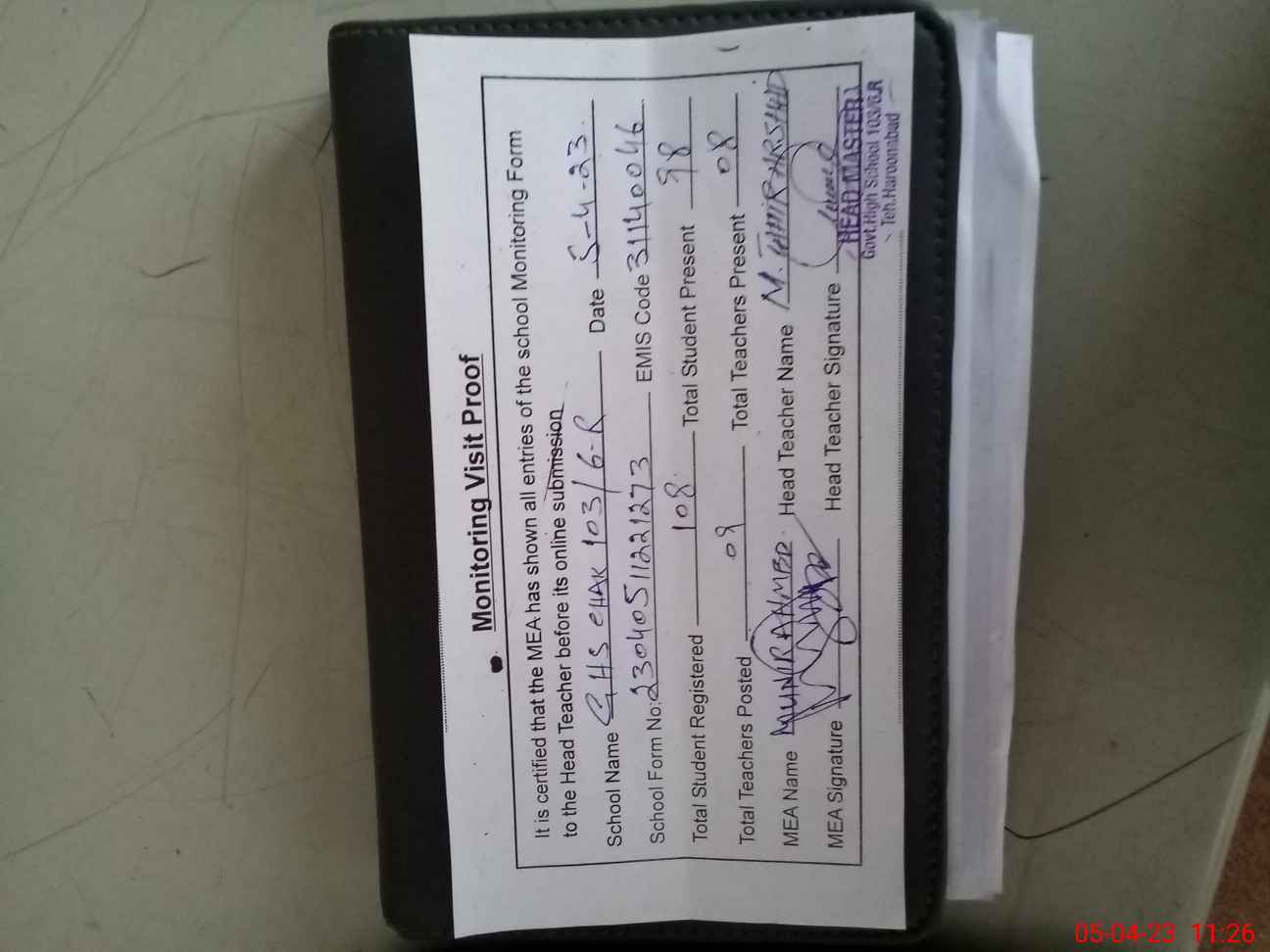 | Attendance Register | Head Teacher | MEA with School | Visit Proof |