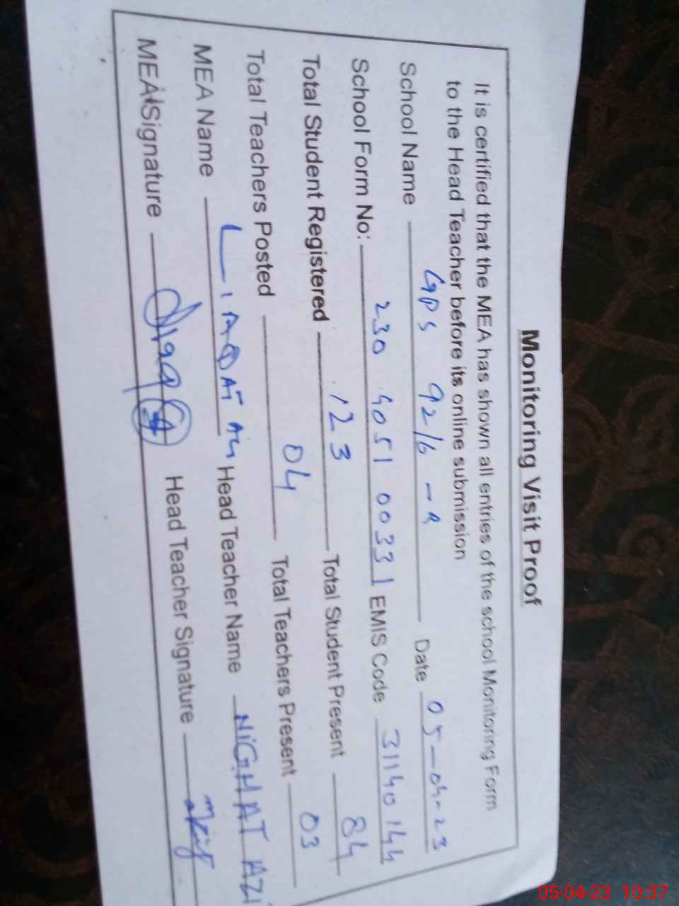 | Attendance Register | Head Teacher | MEA with School | Visit Proof |