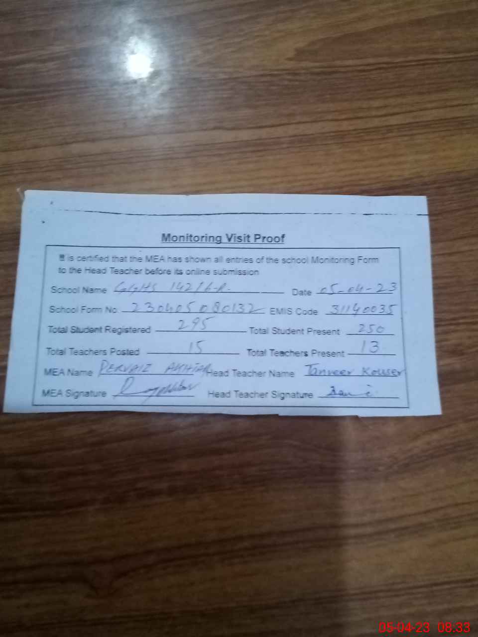 | Attendance Register | Head Teacher | MEA with School | Visit Proof |