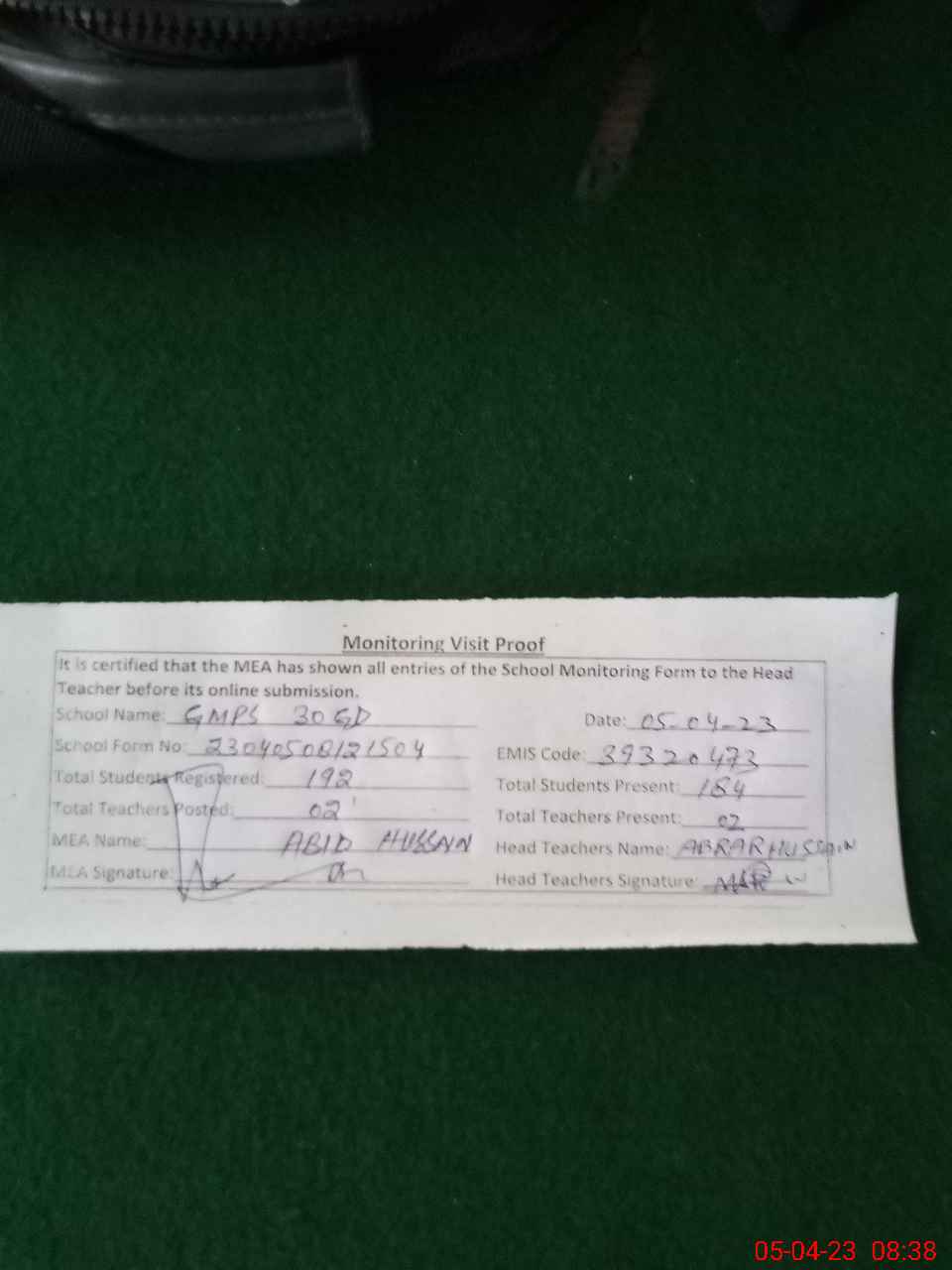 | Remarks (Use Separate Page if Required): As per PMIU monthly monitoring information the name of Head Teacher is shown as Mr Ghulam Mohiyuddin instead of Mr Abrar Hussain 03007253950 CNIC 3530220129259 update the record accordingly | |||||