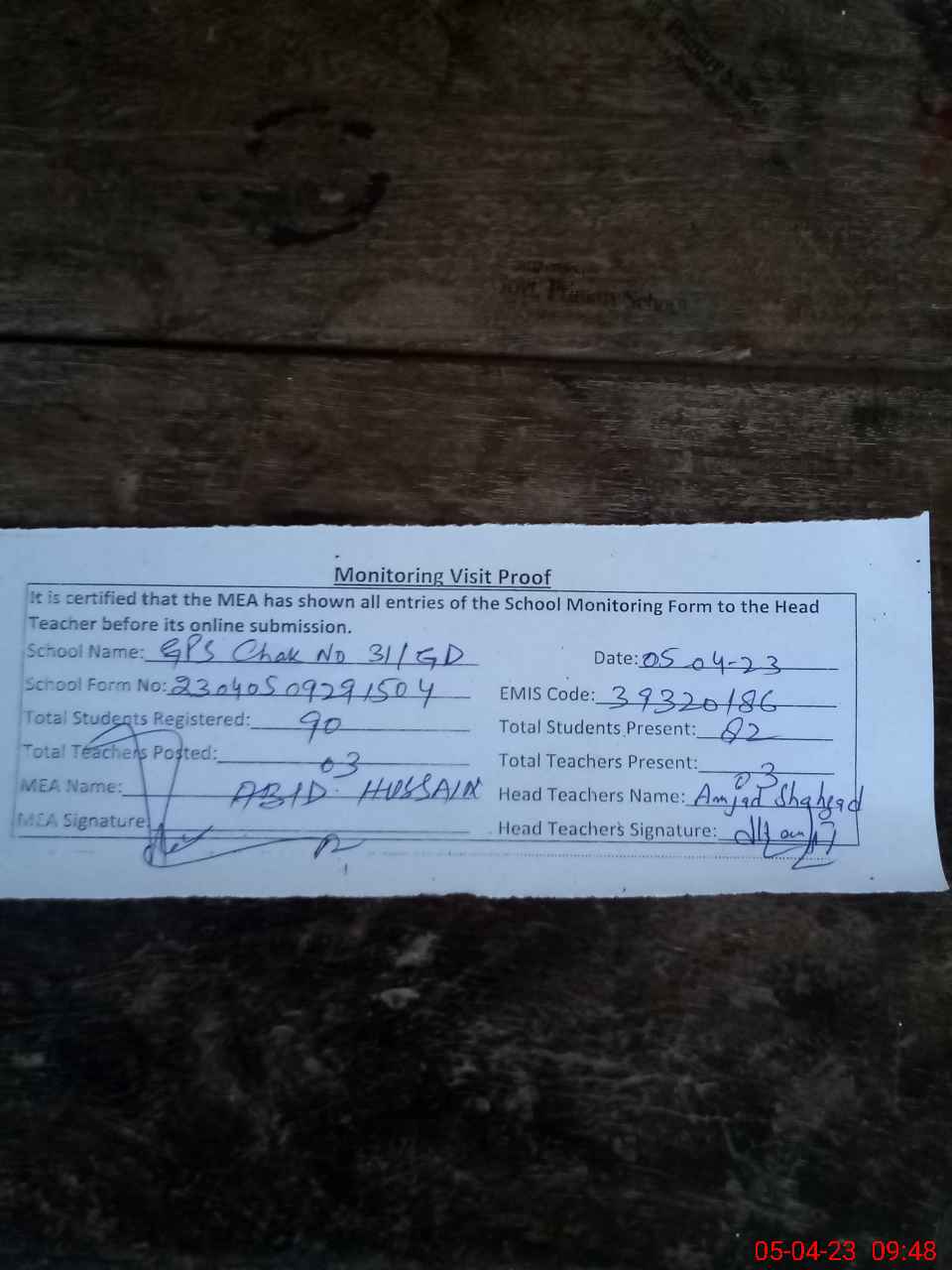 | EMIS Code: 39320186 | Name of School: GPS CHAK NO 31/G.D | |||