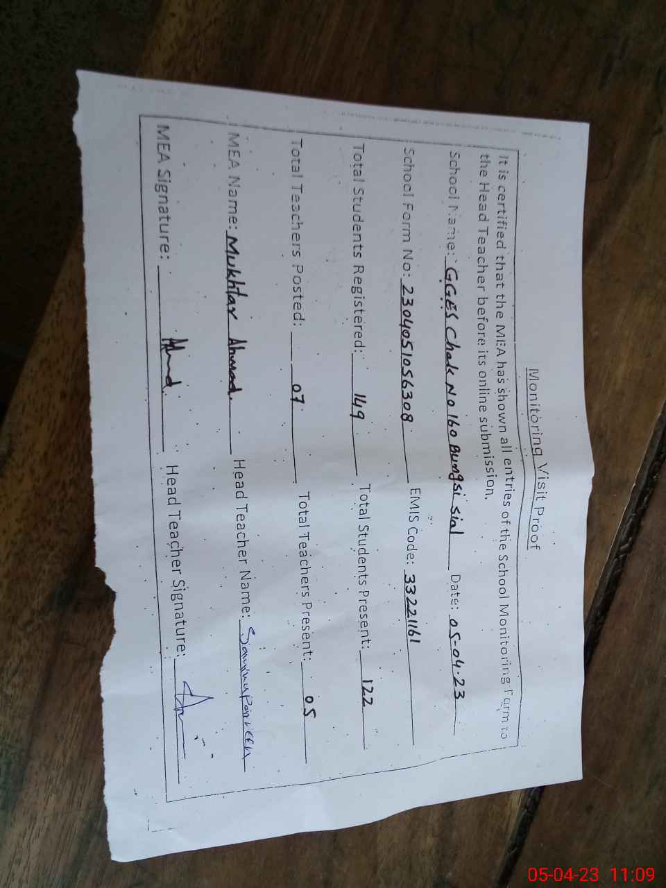 | Attendance Register | Head Teacher | MEA with School | Visit Proof |
