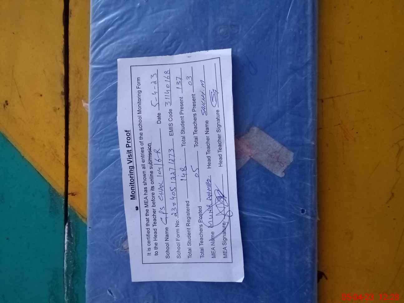 | Attendance Register | Head Teacher | MEA with School | Visit Proof |