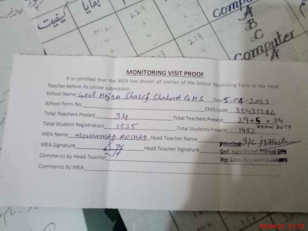 | EMIS Code: 35431286 | Name of School: GOVT. HAJRA SHARIF SHAHEED GIRLS HIGH SCHOOL MOH. HANJRAN WALA | |||