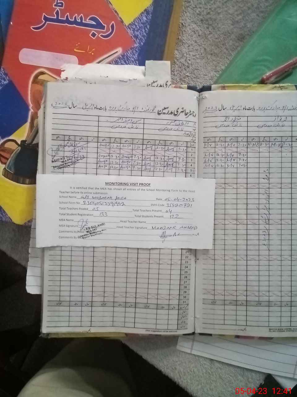 | Attendance Register | Head Teacher | MEA with School | Visit Proof |