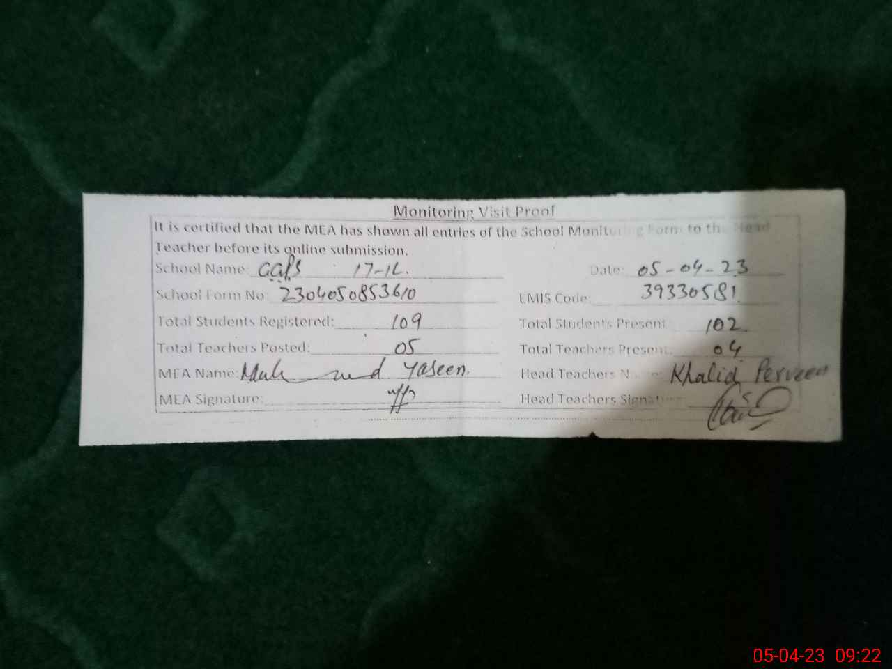 | EMIS Code: 39330581 | Name of School: GGPS 17-1L | |||