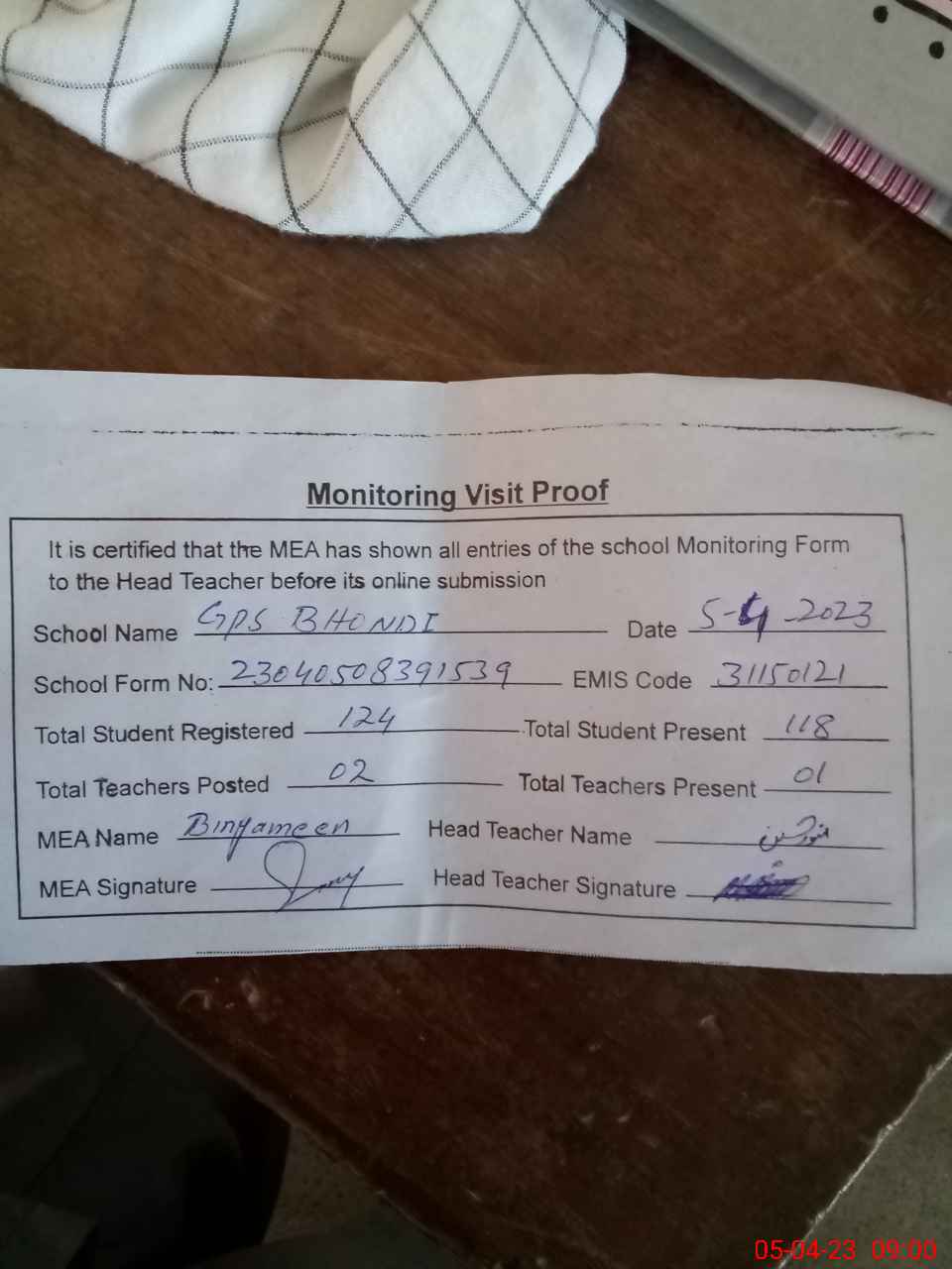 | Attendance Register | Head Teacher | MEA with School | Visit Proof |