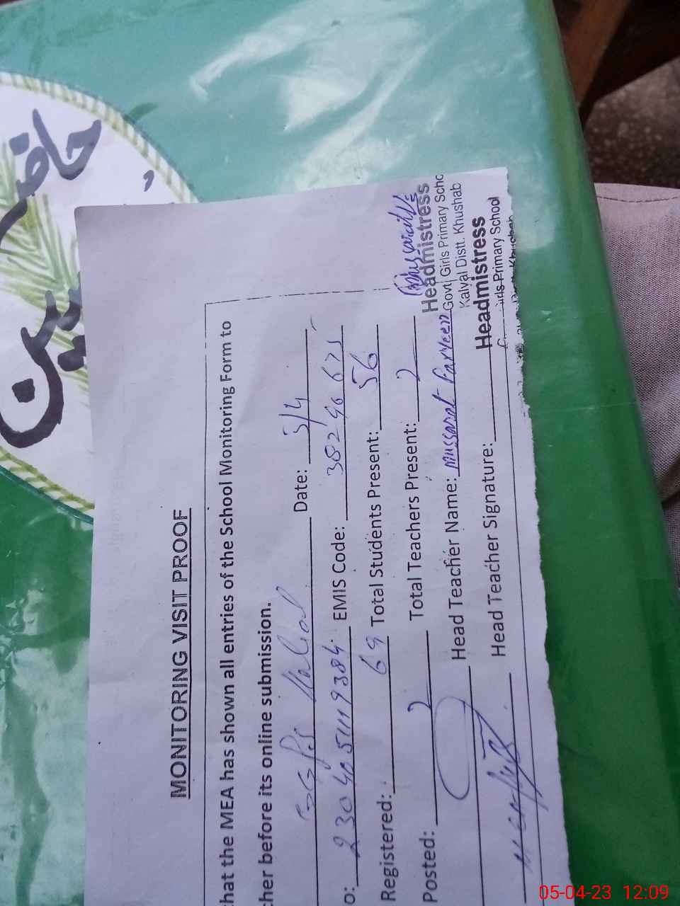 | Attendance Register | Head Teacher | MEA with School | Visit Proof |