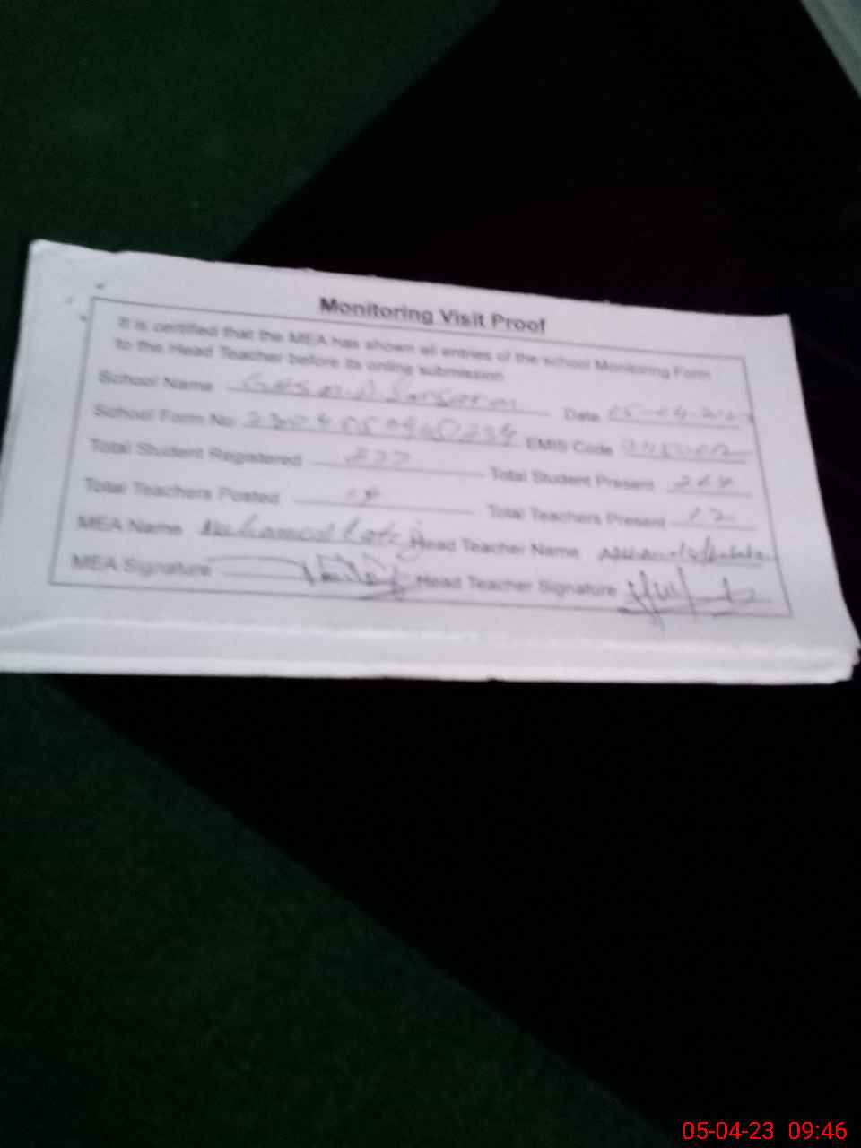 | Attendance Register | Head Teacher | MEA with School | Visit Proof |