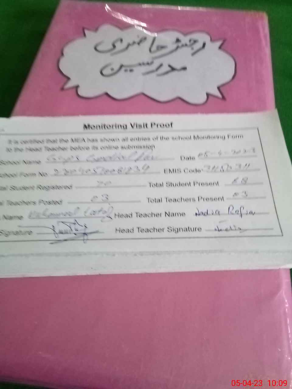 | Attendance Register | Head Teacher | MEA with School | Visit Proof |