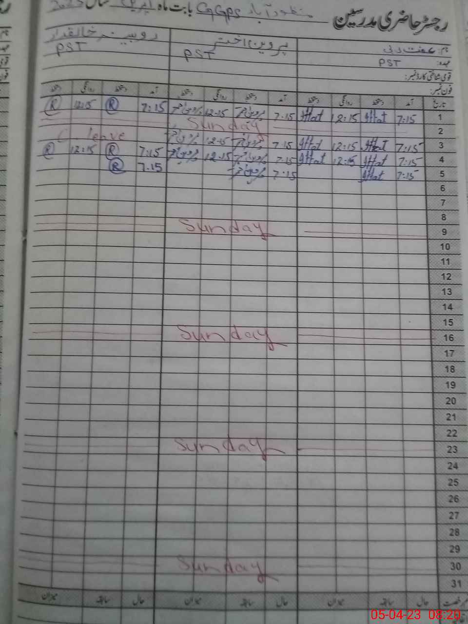 | CNIC | Full Name | Designation | R/C | Absence During Last Calender Month |