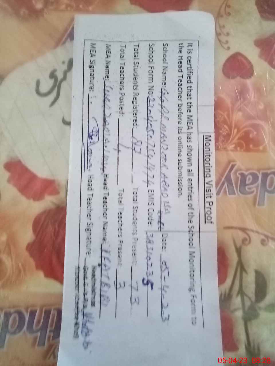 | Attendance Register | Head Teacher | MEA with School | Visit Proof |