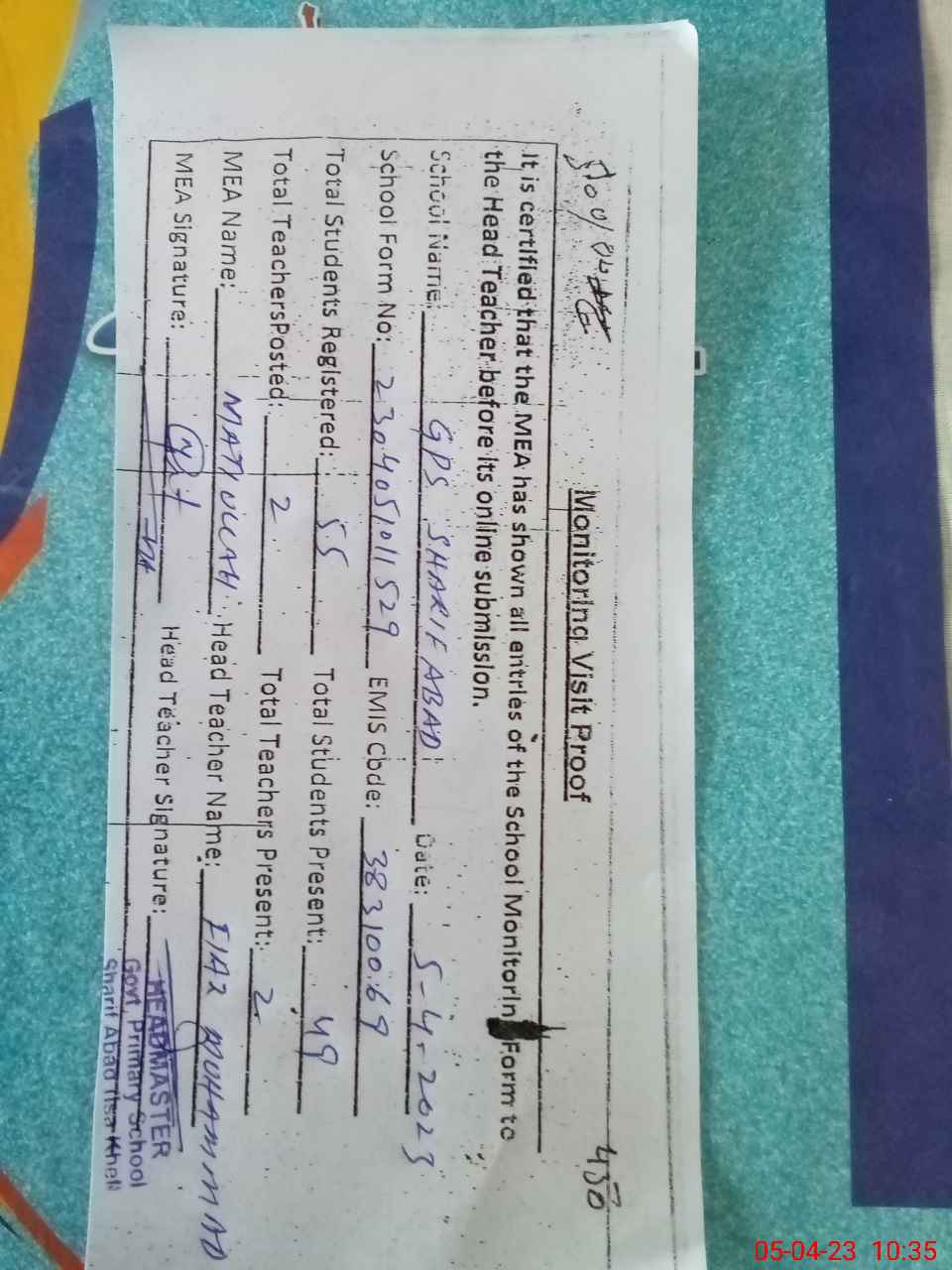 | Attendance Register | Head Teacher | MEA with School | Visit Proof |